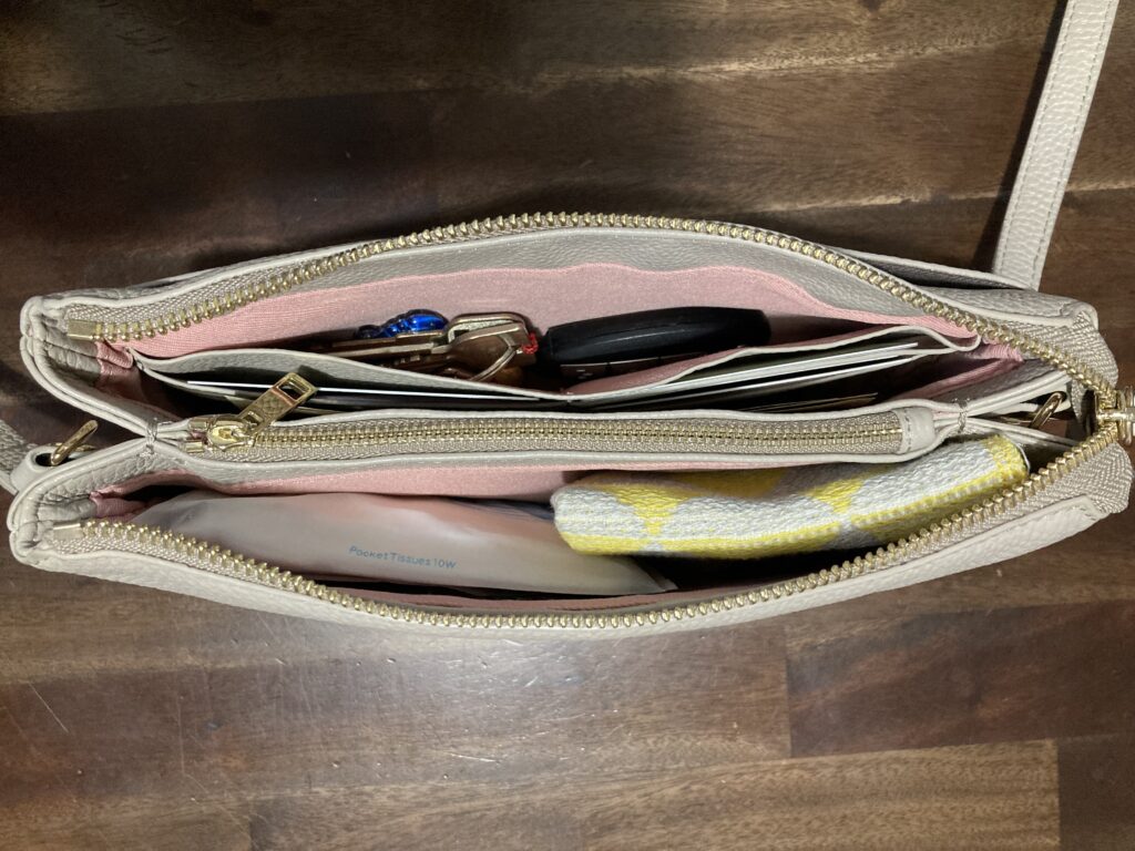保育園の送迎は手ぶらの人も多いと思いますが、私はスマホ、鍵、ティッシュ・ハンカチなどの最低限のものは持っておきたいので、お財布ショルダーを肌身離さず持ち歩いています。