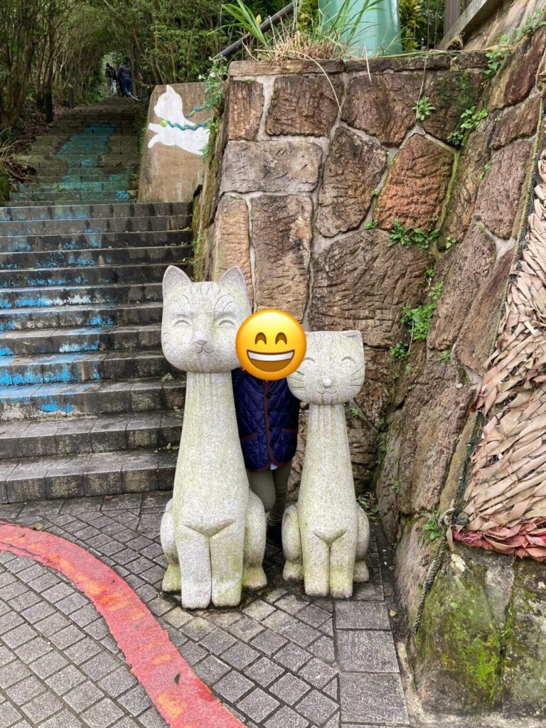 ロープウェイ降りてすぐのところにある猫のモニュメントで記念撮影。