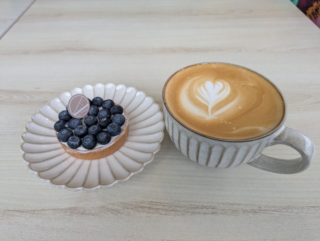 ブルーベリーのタルトとカフェラテを食す。食器もラテアートも素敵。