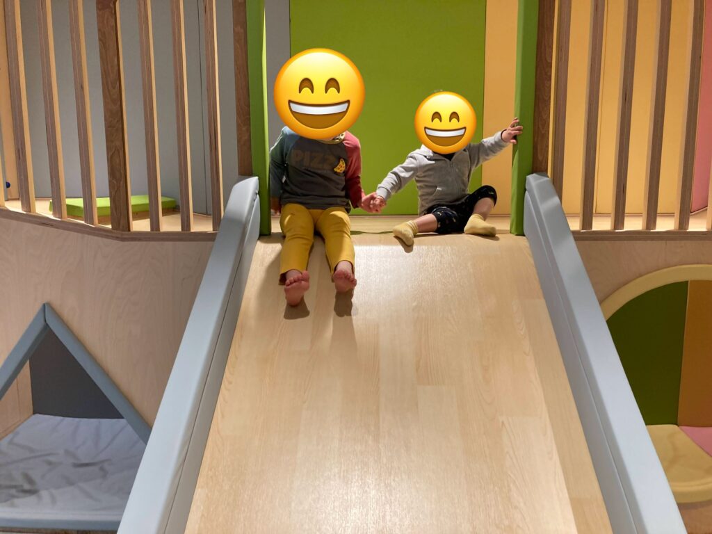 ひとまず朝食を食べたら息子たちお気に入りのキッズスペースでひと暴れ。夫はその間に今日のプランを考えます。